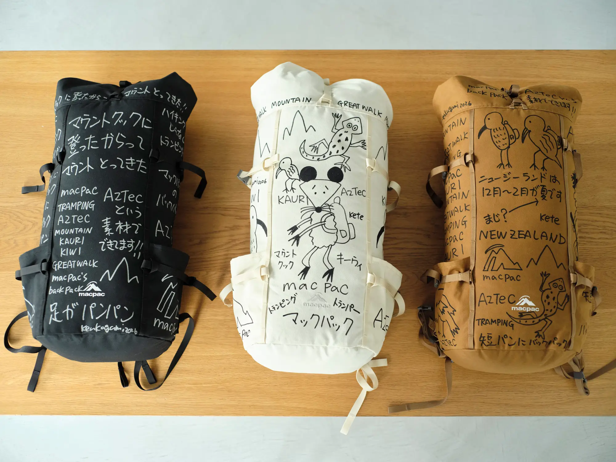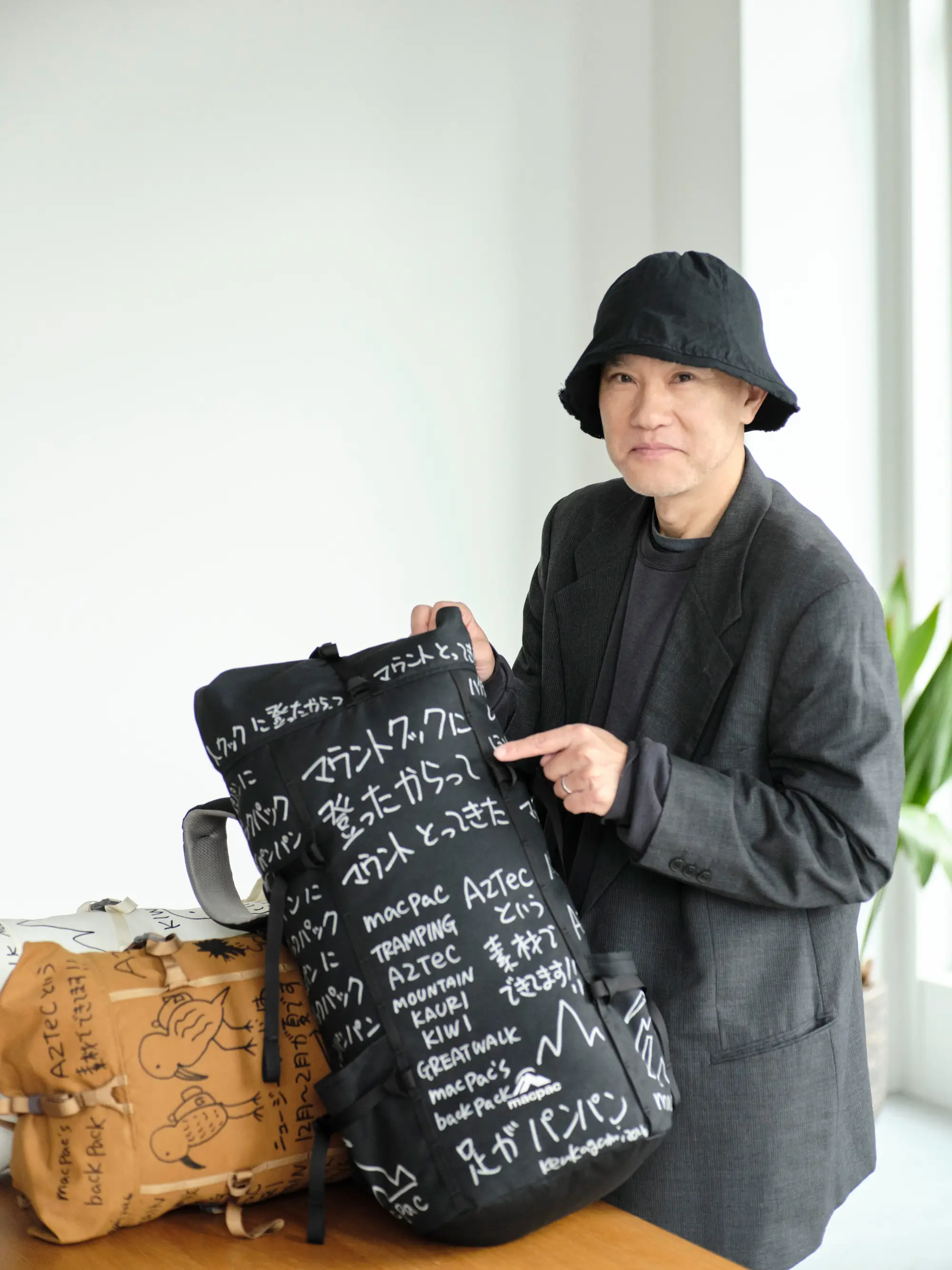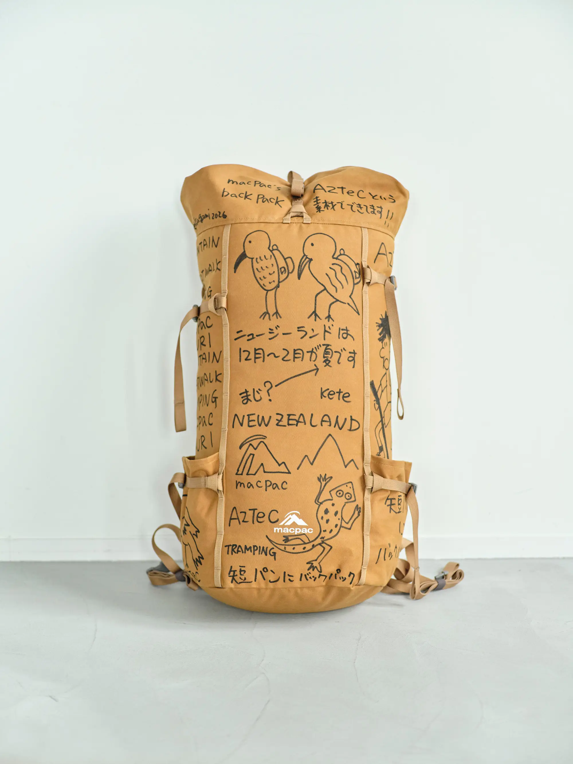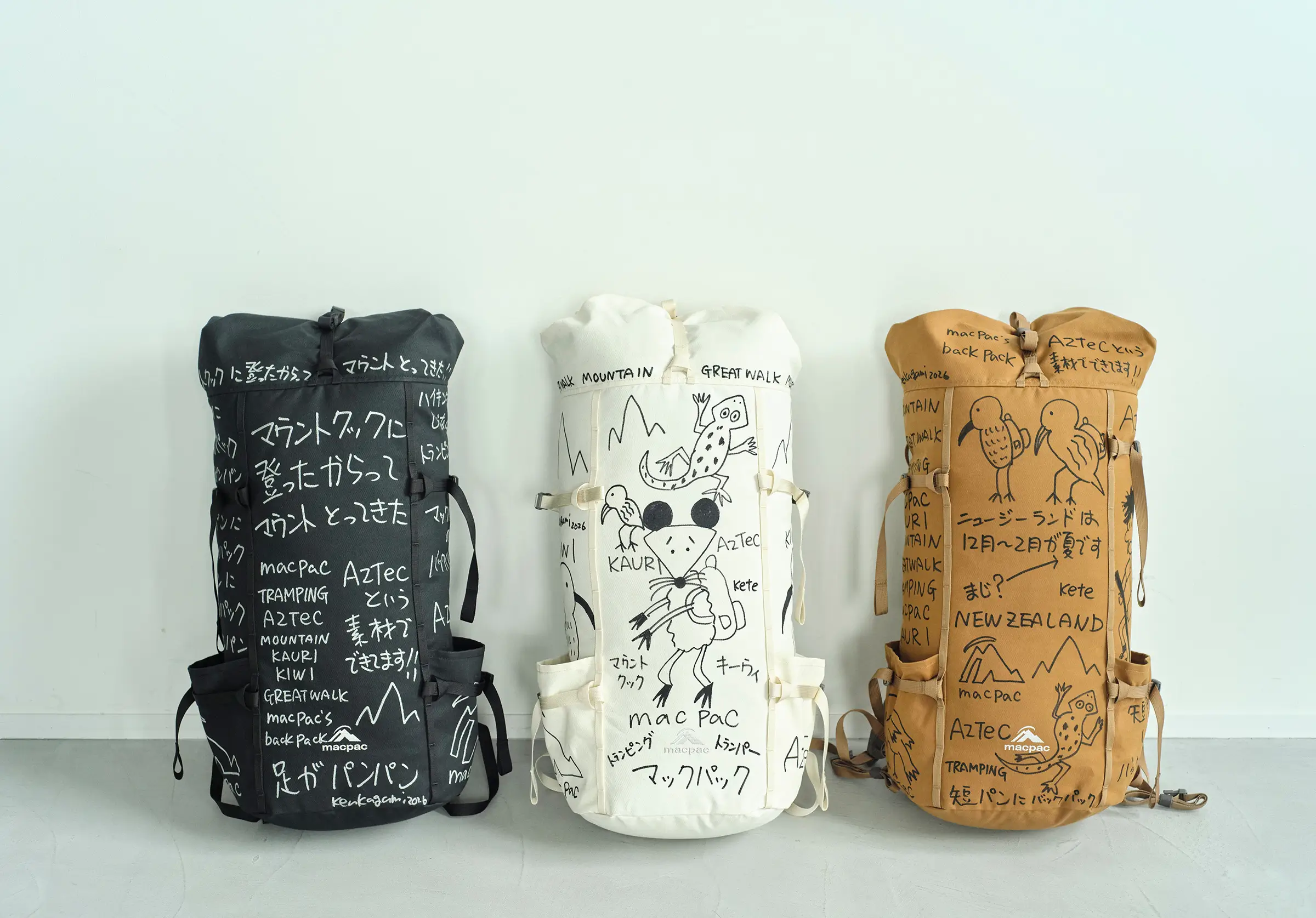 ニュージーランドの自然や、長く歩く文化として親しまれているトランピングを背景に、バックパックを作品として展開している。