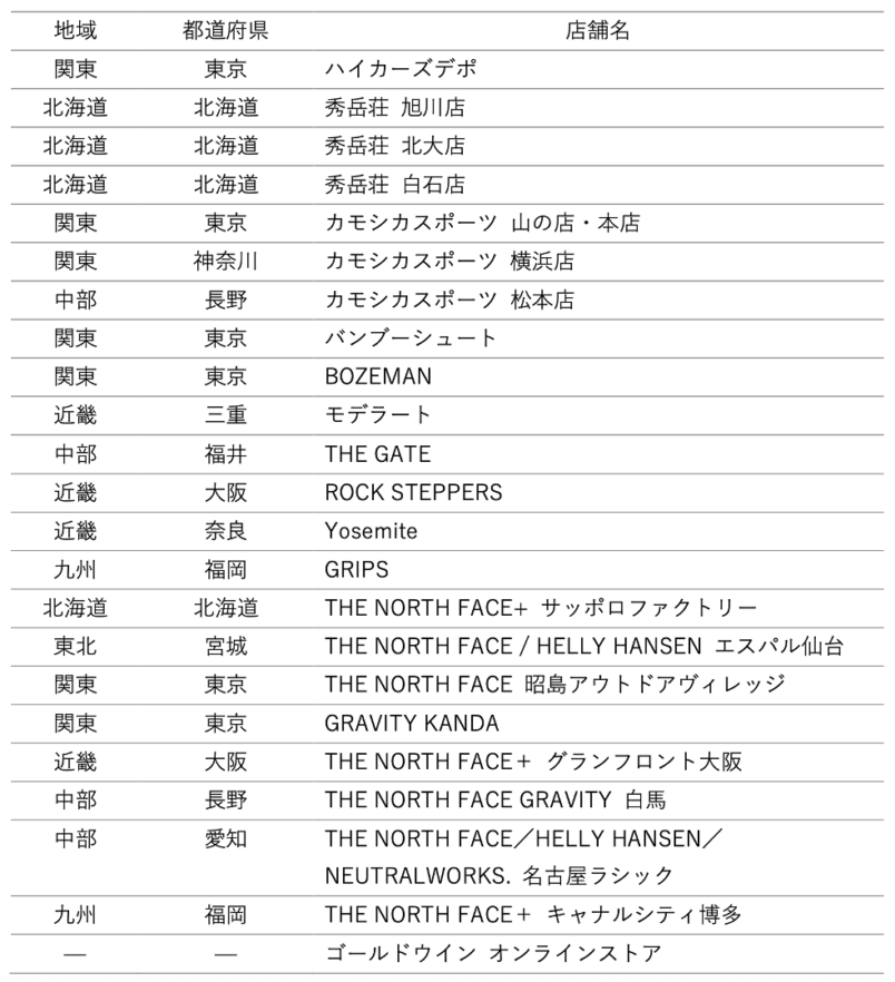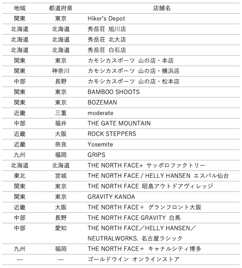 本製品は、当社直営店および共同企画先「Hiker’s Depot」、ならびに展開店舗限定での販売となります。