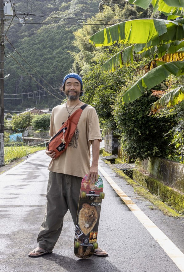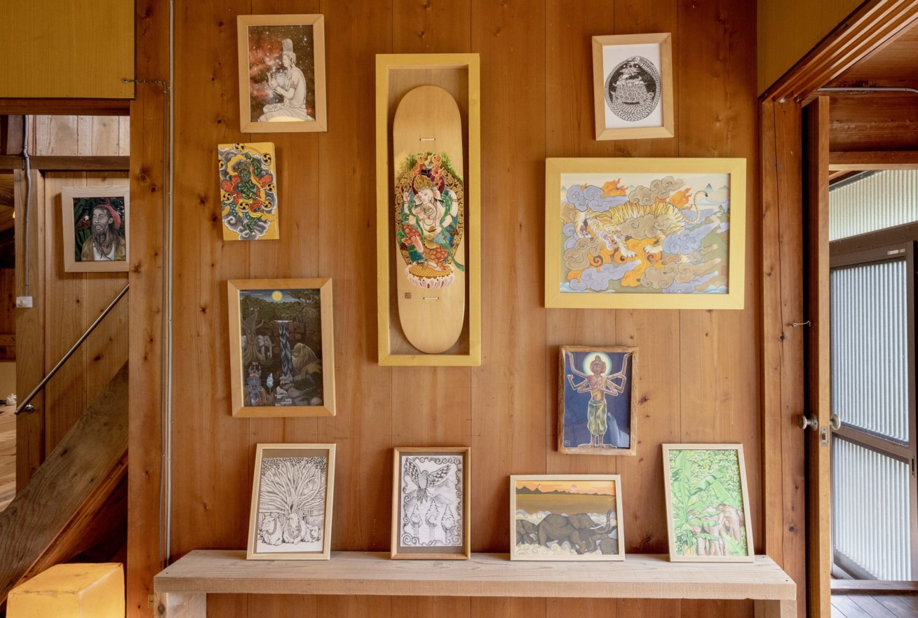 禅サウナや夜のお寺ツアーなど、他では体験できないコンテンツを満喫できる宿坊「Temple Hotel 大泰寺」から、大辺路と反対方向へ県道45号を進む。太田川に近づいたり離れたりしながら、45号線は少しずつ川の上流域に向かっている。その先に見つけたのは、「Mahoraja」というサインが描かれた古民家。「備長炭発祥の地」ともいわれる小匠集落に移住した、絵描きの平田聡さんのギャラリー兼スタジオだ。奈良県初のプロスケーターでもある平田さんが移住したのは10年前。和歌山県南部で伝統的につくられてきた「紀州備長炭」に魅せられ、この地の師匠に弟子入りして備長炭作りをいちから学んだ。