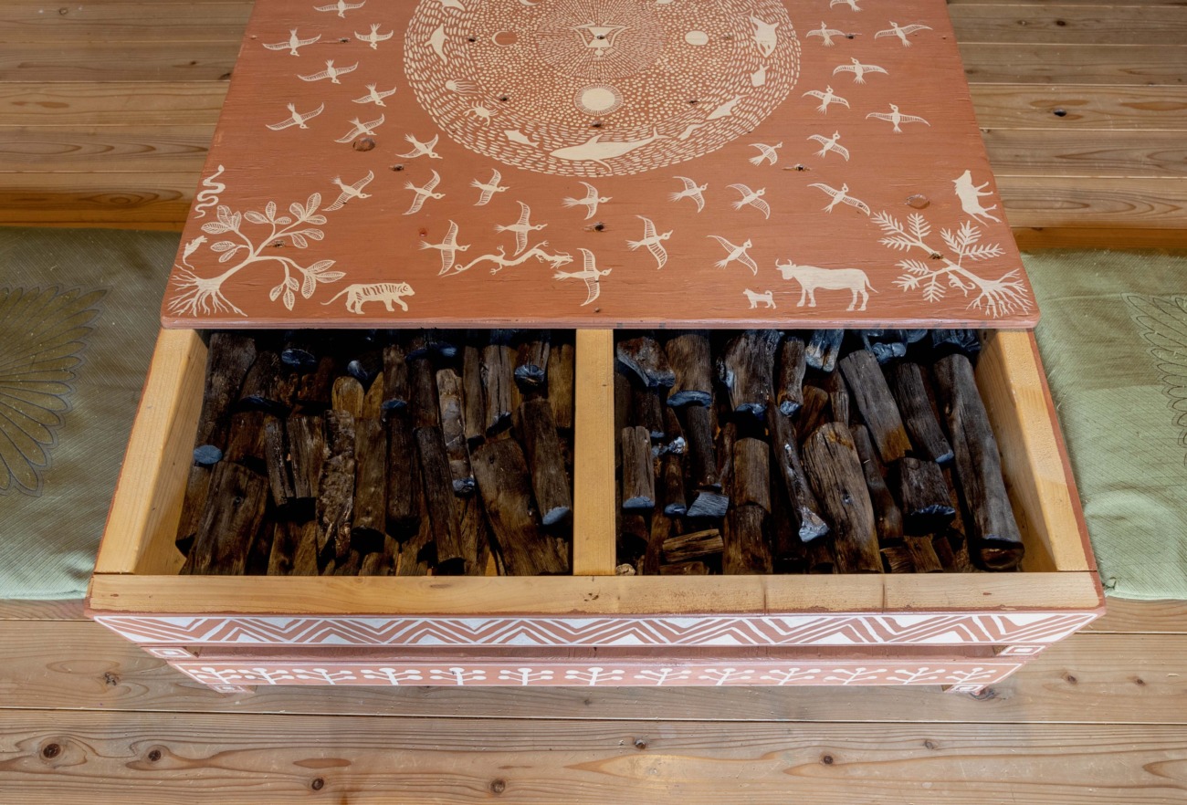 廃屋だった古民家を借り受けてセルフリノベしながら、炭焼き窯も自作した。炭を焼きながら、紀南の神話や自然をモチーフにした絵を描き続けてきた。現在は炭の原木を切り出す場が少なくなってきたこと、絵の仕事が忙しくなってきたことから、炭焼きは不定期に。つきあいのある問屋やここを訪れた人を中心に譲っている。