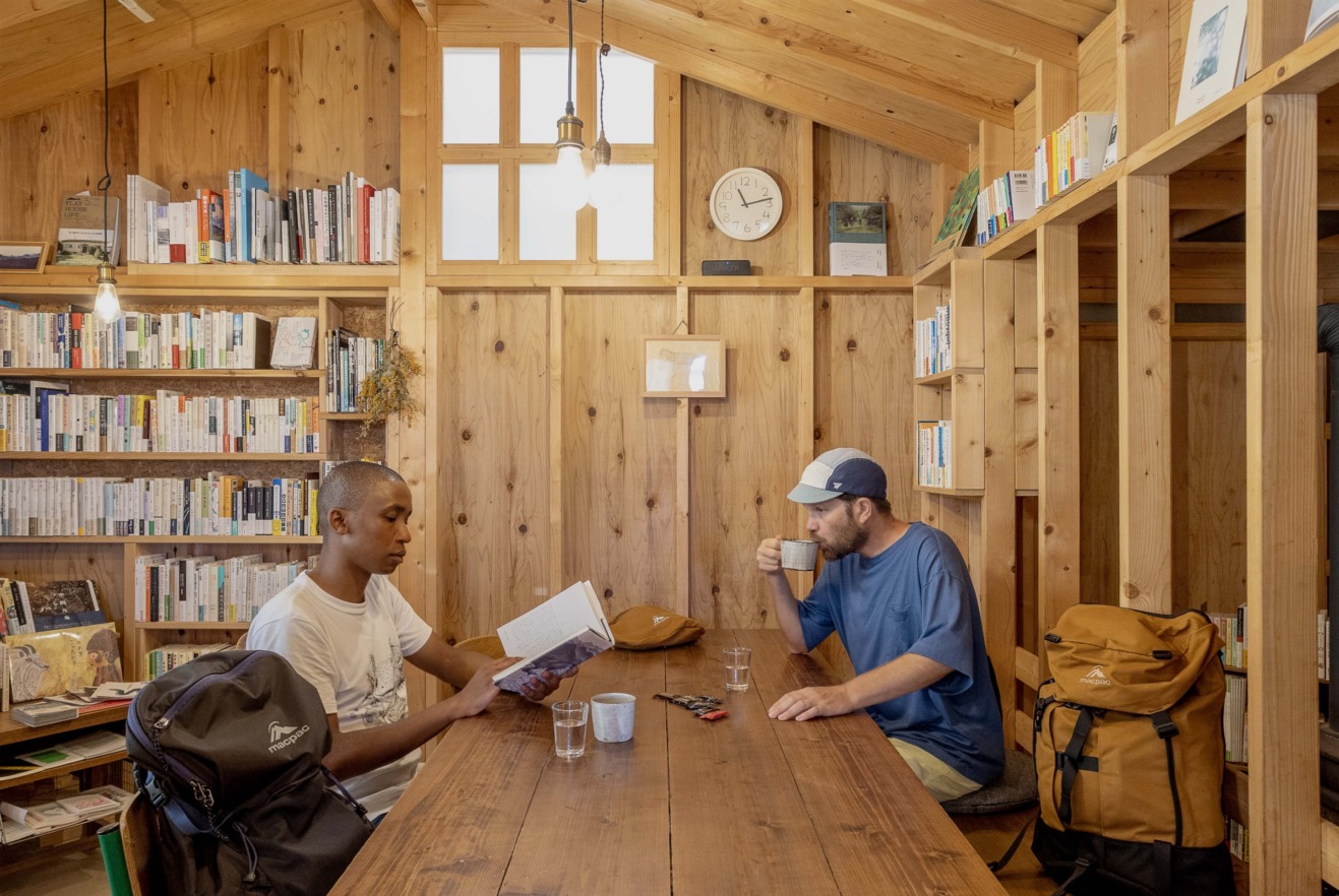 その先に見つけたのは、休憩にぴったりな「らくだ舎喫茶室」。色川地域唯一のよろず屋に併設するカフェ兼コミュニティスペースで、地域住民の憩いの場でもあるらしい。小さな店内は年齢もさまざまな人々で賑わっていた。奥がカフェになっており、地域で採れた野菜や卵を使ったフード、色川茶のほうじ茶ラテなどを提供している。店舗の手前がよろず屋で、色川茶など地域の名産品から日常のおやつまでを扱っている。本が置いてあるのは、なんとここには出版部門があるから!扱っているのは、「自分たちが読みたい」という目線でセレクトした500冊余りだ。