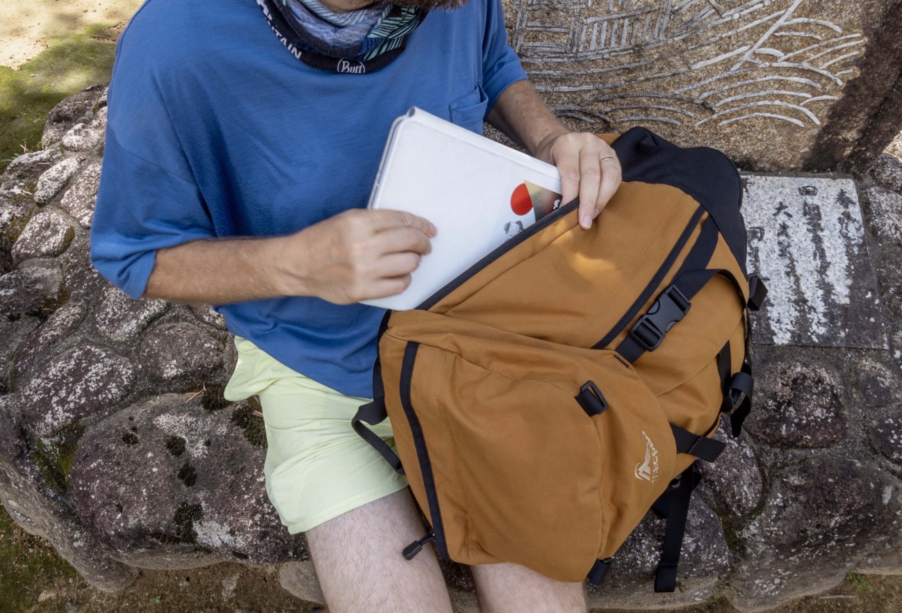 裏道を歩いて那智大社を目指した今回のハイキングでは、一気室の軽量バックパック「ヘスパー30」をチョイスした。本体重量わずか730g(サイズ2)、無駄を削ぎ落としたミニマムなデザインながら、長期のバックパッキングにも対応する本格派。メッシュ状に仕立てて通気性を高めた背面パネルや安定感のあるウエストハーネスのおかげで背負い心地も快適だ。
